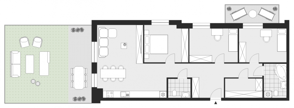 Zapraszamy do zapoznania się z ofertą 4-pokojowego apartamentu, składającego się z pokoju dziennego z aneksem kuchennym, trzech sypialni, łazienki, WC i tarasu. (...)